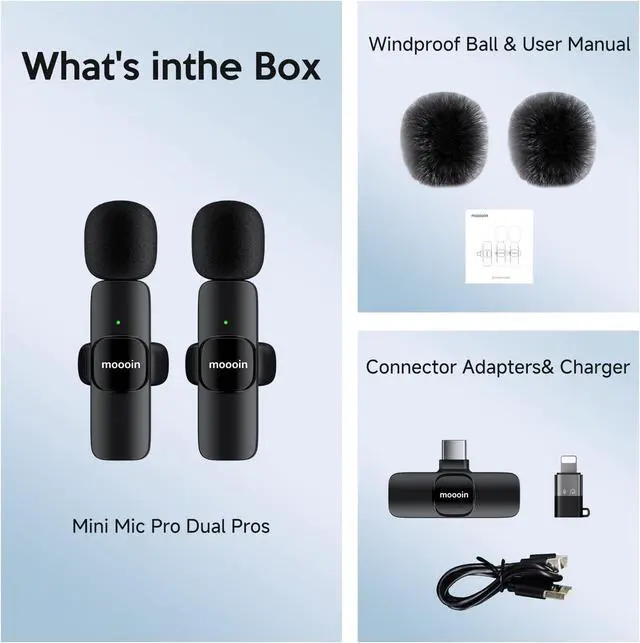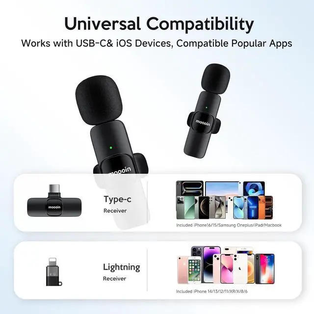 Fully Compatible The product comes with a receiver equipped with both Type-C and Lightning interfaces, perfectly compatible with iPhones, iPads, Android phones, and various cameras and computers with Type-C interfaces. With this one set of equipment, all creative needs can be met.