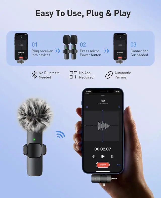 Marathon Battery Performance: Stay powered throughout longest sessions with the microphone for iphone delivering impressive 15-hour receiver battery and 5-hour transmitter runtime. Dual-microphone design allows seamless hot-swapping when charging, ensuring uninterrupted content creation for vlogs, podcasts, and interviews