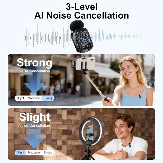 Upgraded Level 3 AI Noise Cancellation: The clip on microphone has a built-in intelligent active noise cancellation chip. Single press the lavalier microphone button to conversion noise cancellation level, when the green light is on. Make sure you record clear, rich, and distortion-free vocals in any situation.