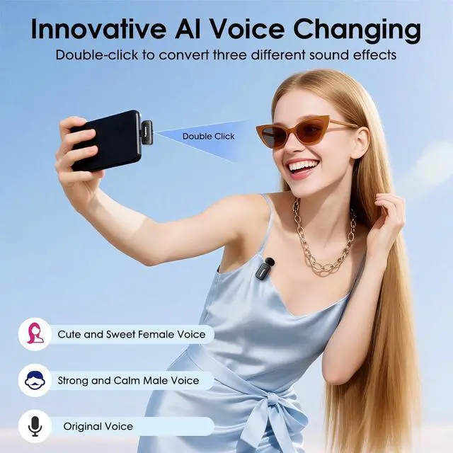 Innovative AI Voice Changing: The mini vlogging microphone supports 3 types of AI voice changing. Double-click on the receiver' s function key to convert, one blue flash is male voice, two flashesis female voice, three flashes is the original voice. You can enjoy a variety of tones, making recording more fun.