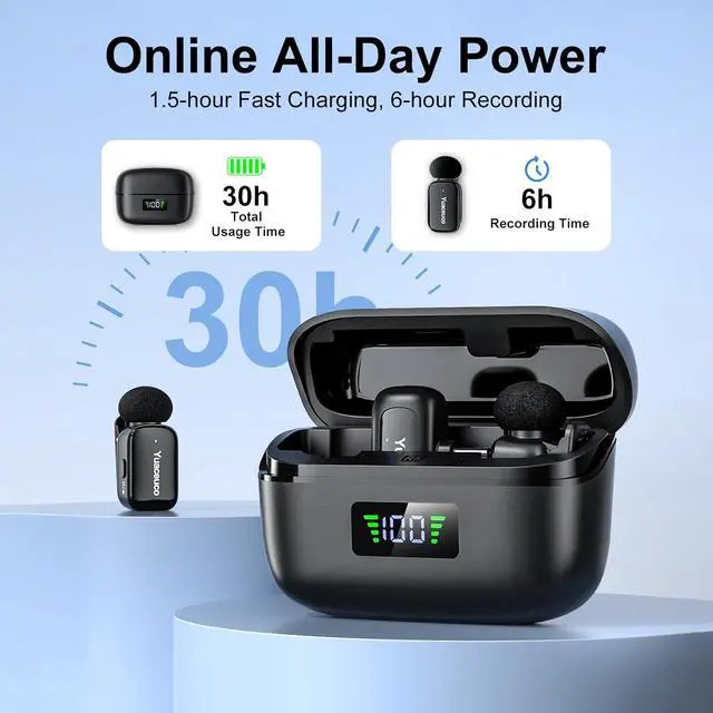Hours Battery Life: The single mini microphone can recording for about 5 hours. The charging case recharges the complete unit 1.5 times. With the charging case, the total recording time extends to 30 hours. Record all day long without worrying about running out of power while recording.