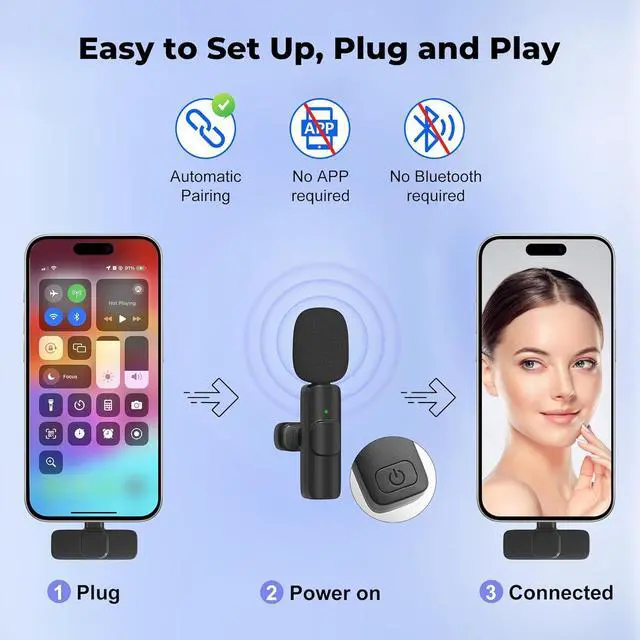 Quick Auto Connection Setting up the mini mic only takes 2 simple steps: plug the receiver into your phone and turn on the wireless lavalier microphone. The auto-connection will be completed in just 3 seconds. Its truly plug-and-play, with both the receiver and microphone indicating a successful connection with green lights
