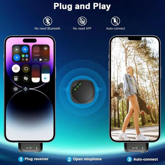 Plug-and-Play/Auto-PairingFactory-prepared for instant use, this wireless microphone system eliminates setup hassles with automatic pairingsimply plug the receiver into your device (Features USB-C and Lightning adapters) and start recording in 1 second. No Bluetooth or app required. The receiver doubles as a power pass-through, letting you charge your phone while recording, perfect for long shoots