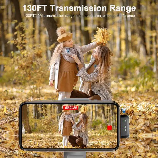 30-Hour Total Battery Life with 130FT RangeEnjoy 6-8 hours of continuous recording per charge, extended to a total of 24-30 hours with the included charging caseperfect for all-day shoots. The charging case delivers 2 full recharges and features an LED screen to track battery levels, while the receivers LED indicators show real-time power status. With advanced 2.4G technology, experience seamless 130ft/40m wireless transmission with zero latency, ideal for dynamic content creation, outdoor vlogs, or live events where mobility matters