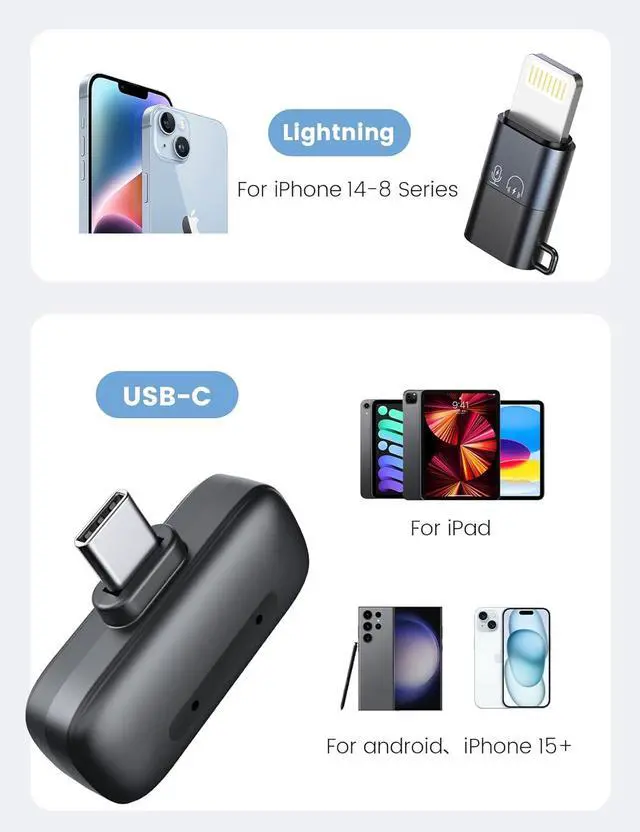 Plug & Play for iPhone, Android, Tablets and Laptops No app, no Bluetooth, no menu diving. The Lightning receiver works with your iPhone and iPad, and the USB-C receiver connects to Android phones, tablets and laptops. Just plug in, auto-pair in seconds and enjoy a stable wireless range of up to 65ft with smooth audio-video sync.