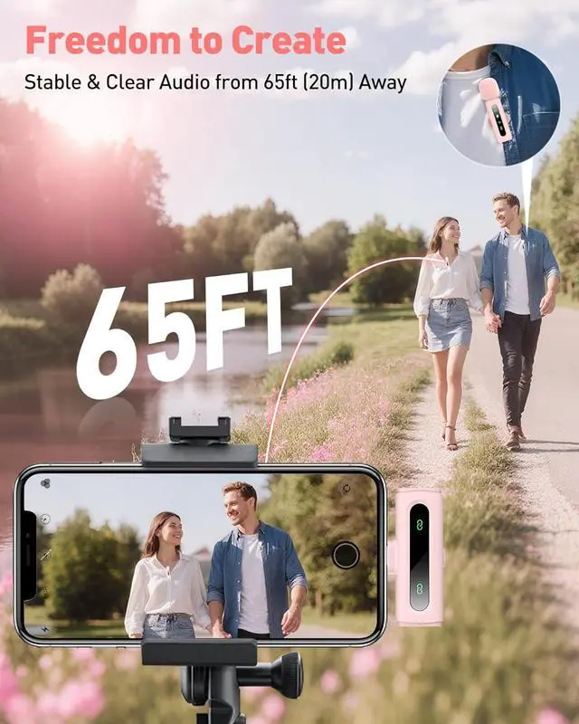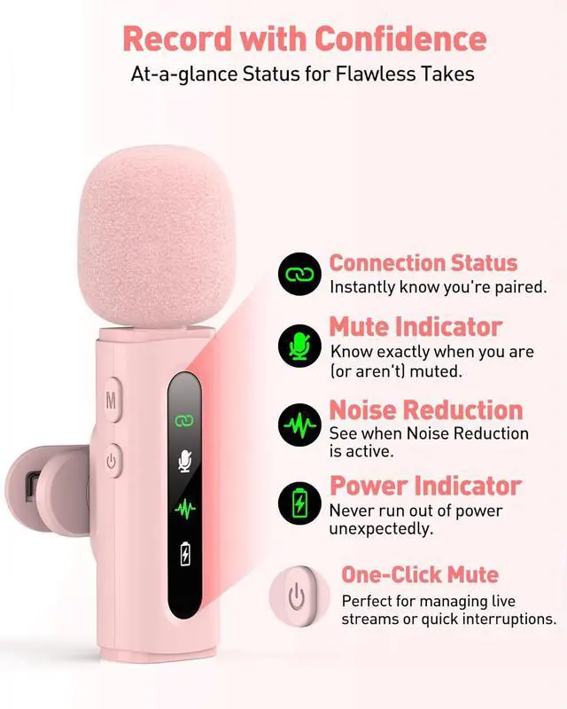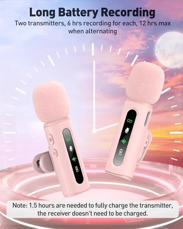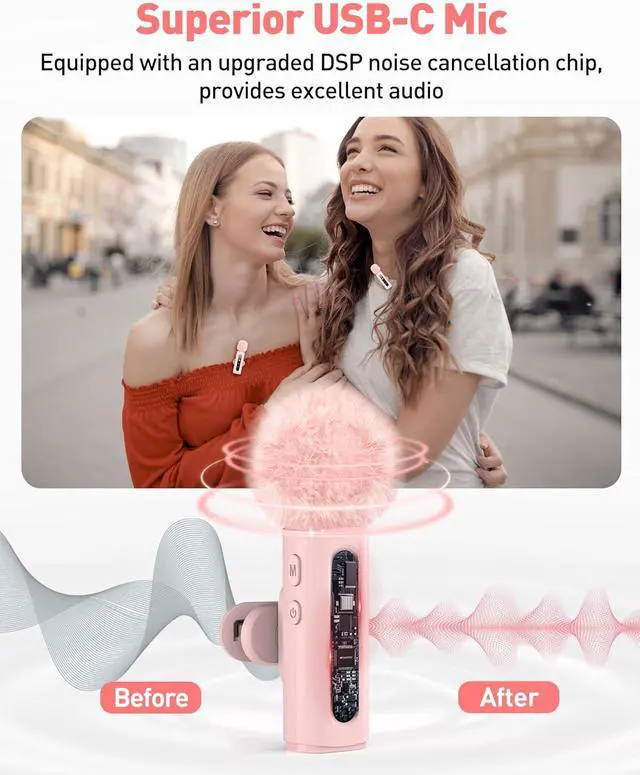 Active Denoise: Experience exceptional sound clarity with the GoorDik USB C wireless lavalier mic featuring advanced active denoise technology. With dual noise reduction modes noise reduction mode and original sound mode. The wireless clip-on C port mic is equipped with 2 furry outdoor microphone windscreen muffs and 4 pink foam mic covers, ensuring crystal-clear audio even in noisy and windy environments