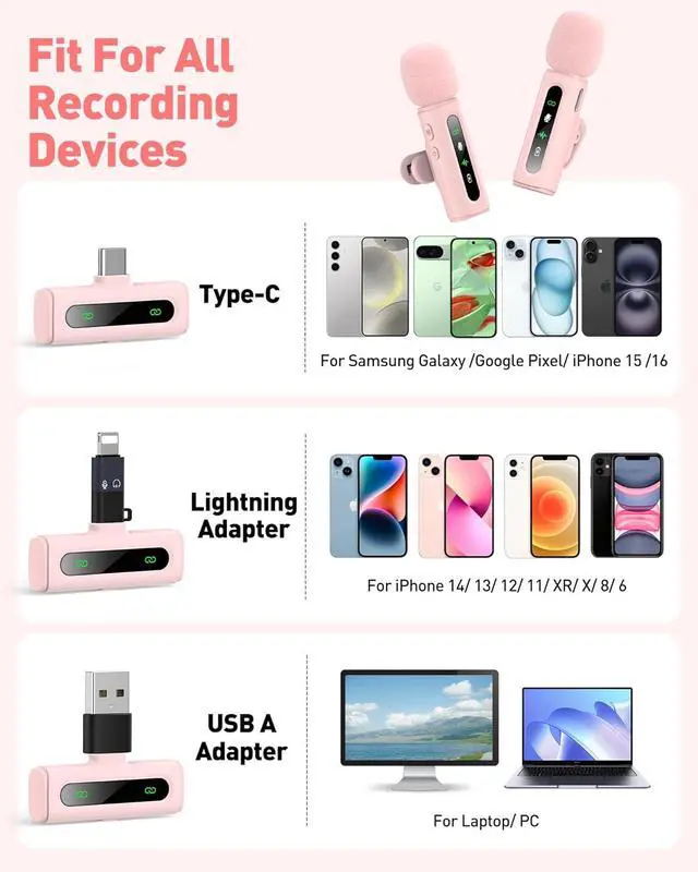 Universal Compatibility: Native USB-C for iPhone 17/16/15 & Android; includes Lightning & USB-A adapters for iPhone 14/earlier, iPads, & Laptops. Whether vlogging on mobile or recording on PC, this pink microphone set works with all your devices