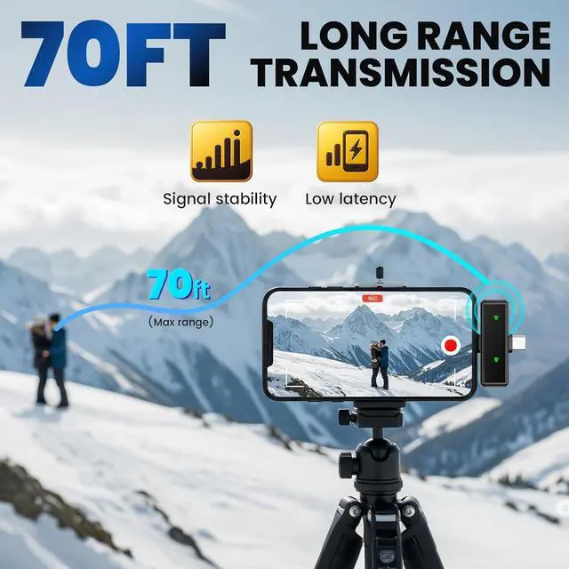 70FT RANGE & DUAL-MIC SYNC: Stable 70ft (21m) wireless transmission plus simultaneous recording with 2 Microphones. Perfect for interviews, podcasts, duo presentations, or couples vlogging. Move freely in dynamic environments while both Mics capture crystal-clear audio for professional-grade results.
