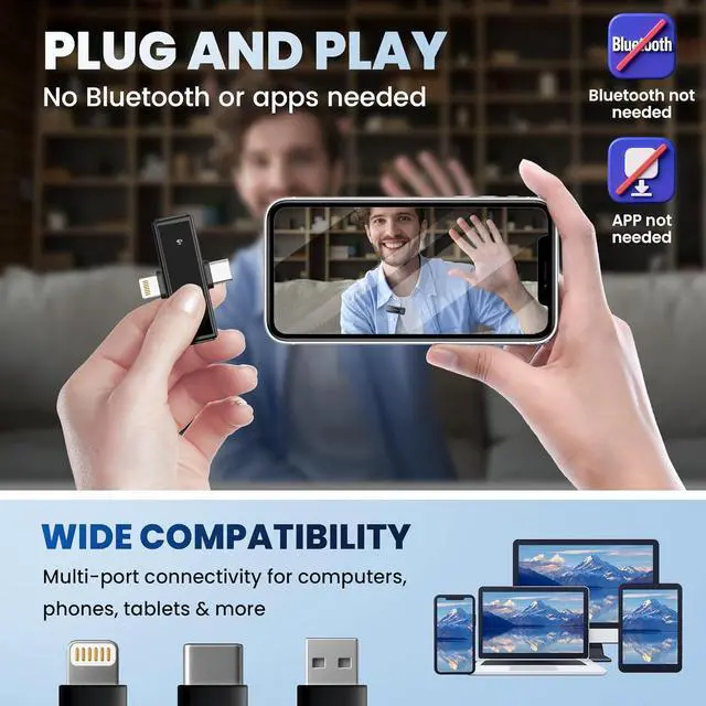 PLUG & PLAY: Connect instantly! This versatile Microphone features Lightning (for iPhone/iPad), USB-C (Android/Mac), and USB-A (PC) connectors. Plug directly into virtually any device start recording videos or streaming in seconds, no adapters needed.