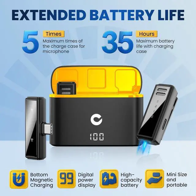 35-HOUR MEGA BATTERY: The 600mAh charging case delivers a massive 35 hours total runtime (7hrs per Mic × 5 full charges). Achieve uninterrupted creative freedom., never worry about running out of power.