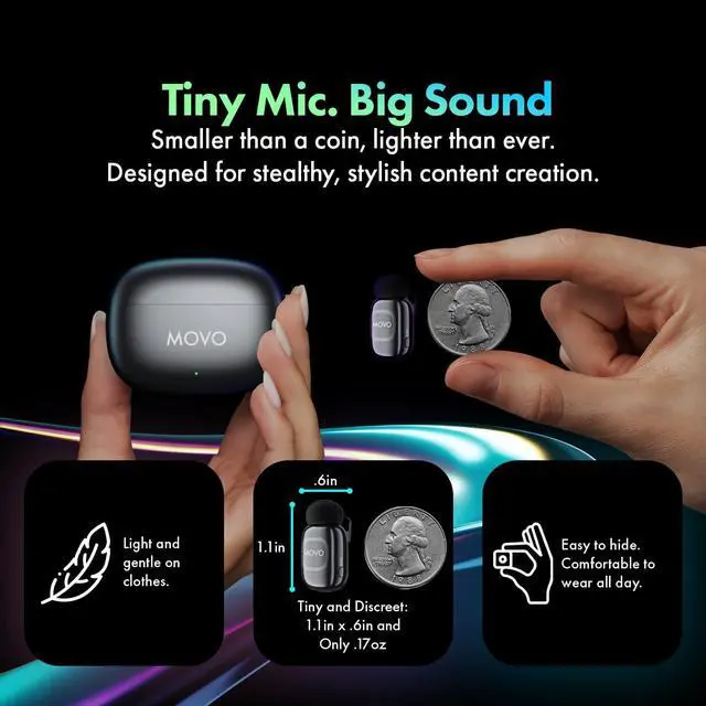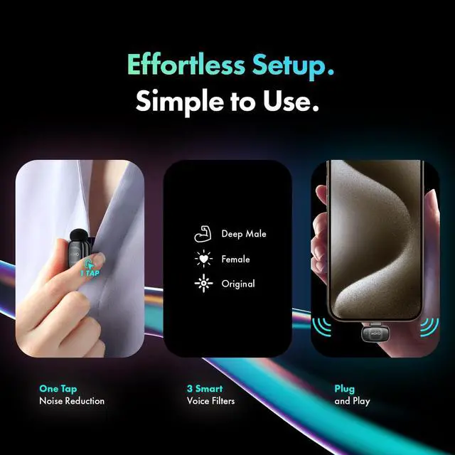 & ANDROID: Two clip-on microphones, one tiny receiverplug directly into your iPhone 15/16/17, Android, or iPad Pro and start recording. No adapters, no apps, no Bluetooth pairing. Just pro-quality audio in seconds.