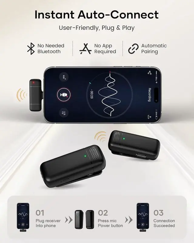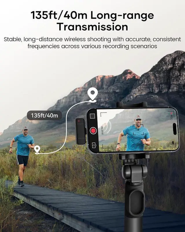 Portable & Versatile Wireless Mic: Designed for portability, this small and lightweight lapel microphone wireless can be handheld, clipped to clothing for convenient use in any environment. The iPhone microphone offers stable transmission within a range of 135 ft in open areas. Ideal for content creators, it provides stable, low-latency recording for both indoor and outdoor use, ensuring the best experience for long-distance recording.