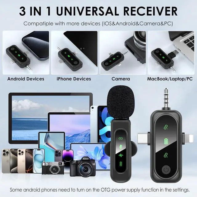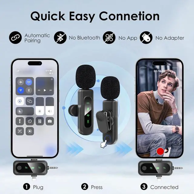 Automatic PairingWireless microphones use the latest 2.4GH z wireless technology for ultra-low latency. No additional software or bluetooth pairing is required. Just plug the receiver into your device and long press the power button of the transmitter and receiver, lapel microphone automatically connects without any manual pairing process. This feature saves you time and ensures hassle-free operation, making it perfect for users who need to start recording immediately.