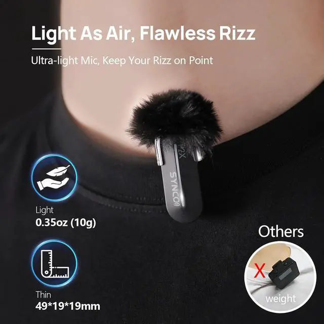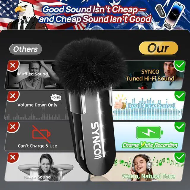 Professional Sound Quality SYNCO Wireless Lavalier Microphone ensures superior audio quality with One-Touch Noise Reduction technology. Background noise is minimized for clear human voice recording with Instant Noise Cancellation. Wireless Microphone for iphone 14/13/12/11 and more.