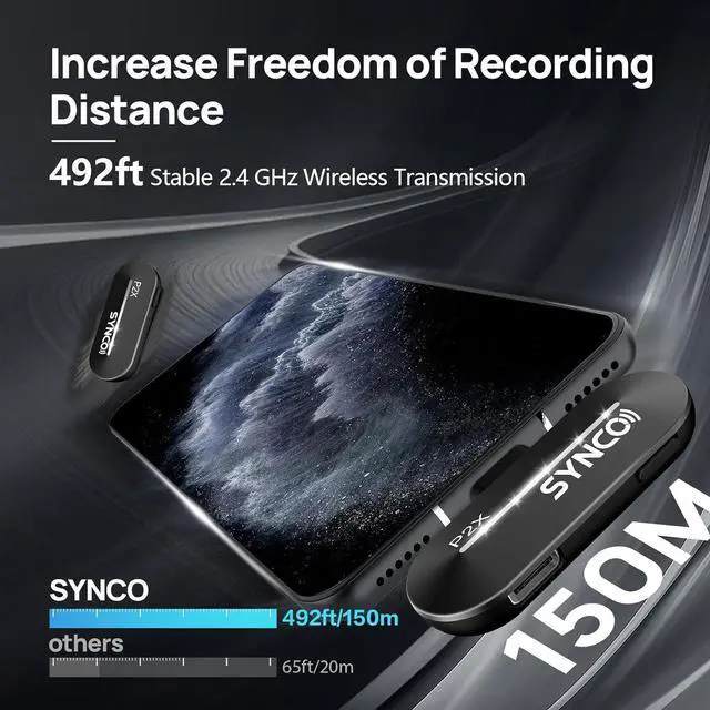 Clear Recordings in 492ft/150m Range The SYNCO lapel mics powered by Syncoder 3.0 and intelligent DSP chip, being great for video calls or recordings, It filters out background noise and delivers clear sound up to, great for interviews, virtual meetings, taking podcasts, vlogging, live streaming, indoor and outdoor, ideal device for youtube, tiktok video creators.
