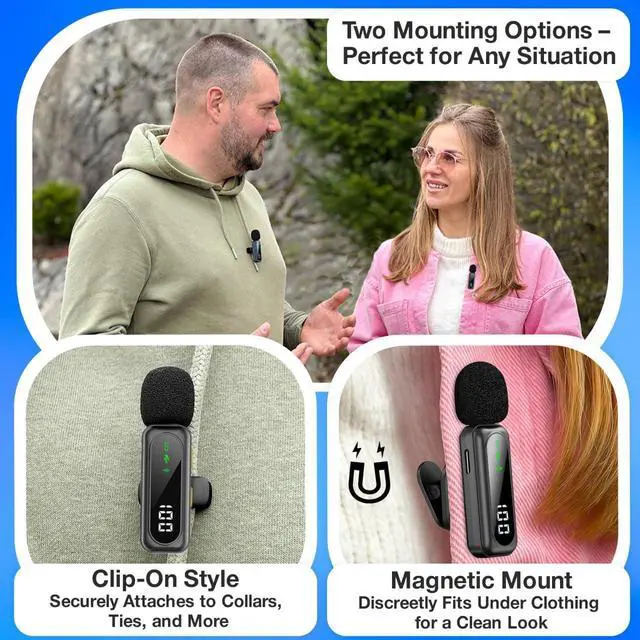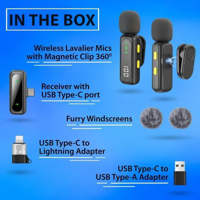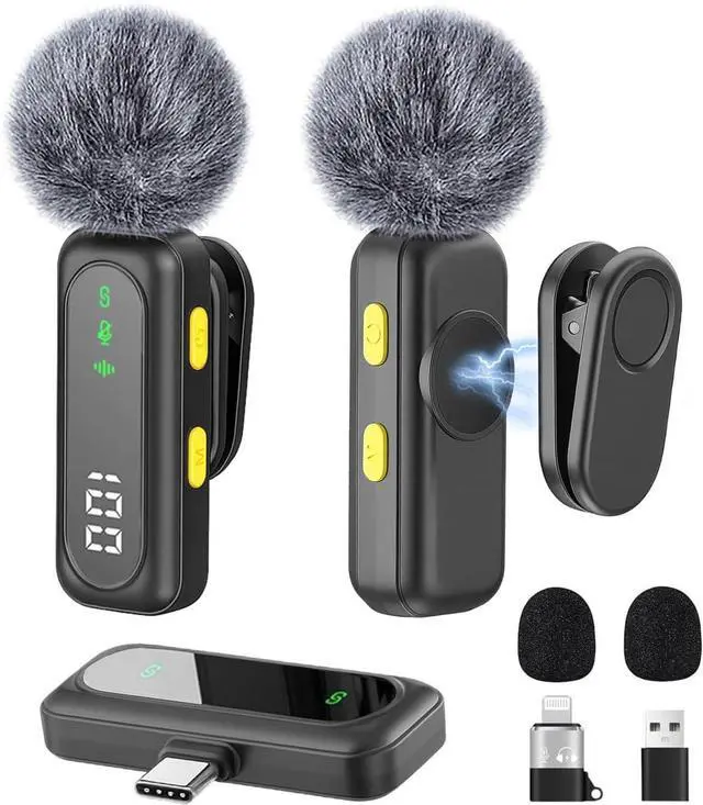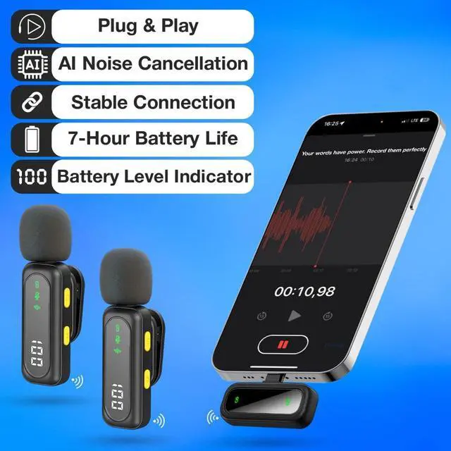 Plug & Play with Intuitive Controls No apps or Bluetooth needed. Just plug the USB-C receiver into your phone, tablet, or laptop and start recording. LED indicators show Noise Reduction, Original, and Mute modes at a glance. Rotatable clip ensures optimal pickup from any angle.