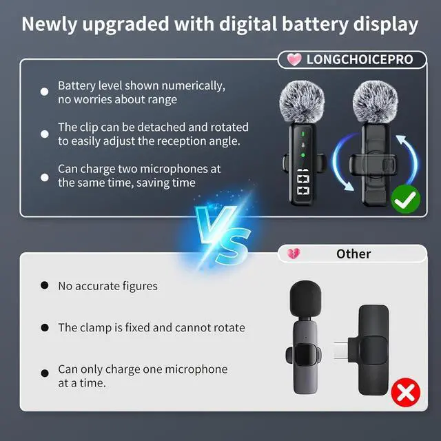 AI Noise Cancellation: Crystal-clear audio for iPhone and Android devices. Features 48KHz/24bit high-fidelity sampling, 20-20KHz full frequency response, and SNR80dB. Built-in DSP chip and -38dB omnidirectional mic capture every detail. One-click AI noise reduction filters wind, traffic, crowd noiseperfect for outdoor vlogs, live streams, and content creation. Includes windproof fur covers for enhanced wind noise cancellation