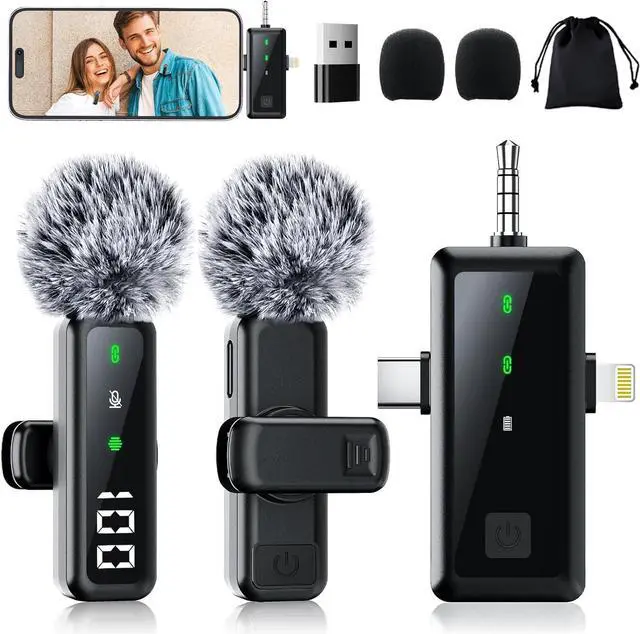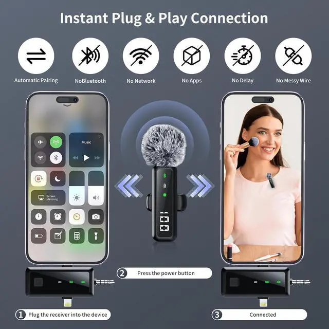 Plug & Play + Universal Compatibility for iPhone, Android, Camera, iPad: Auto-pair in 1 secondjust plug receiver into your iPhone, Android, Pad, Mac or PC. No Bluetooth, APP, or network needed. Zero latency for smooth vlogging and recording. Includes USB-C/Lightning/USB-A/ 3.5 mm Jack adapters, compatible with iPhone 17/16/15/14, Samsung, Google Pixel, iPad Pro. Perfect for TikTok, YouTube creators