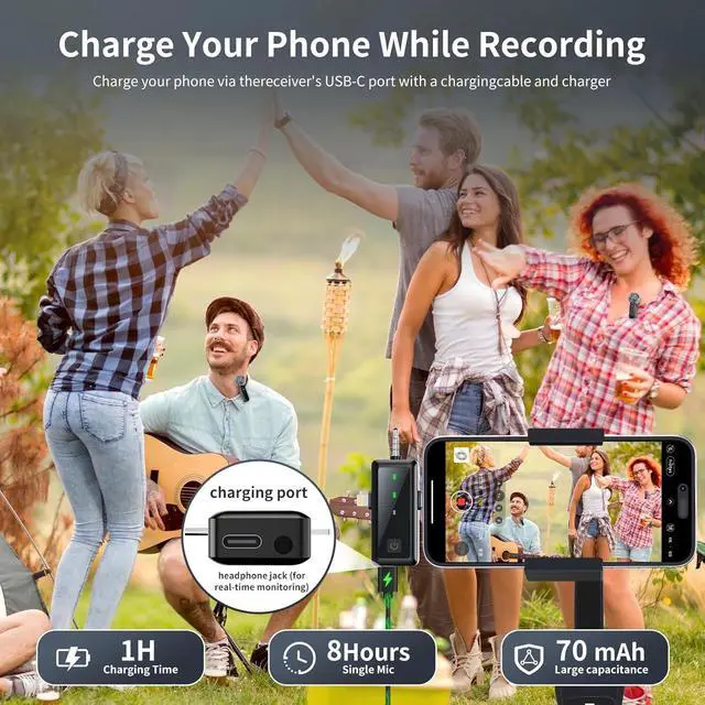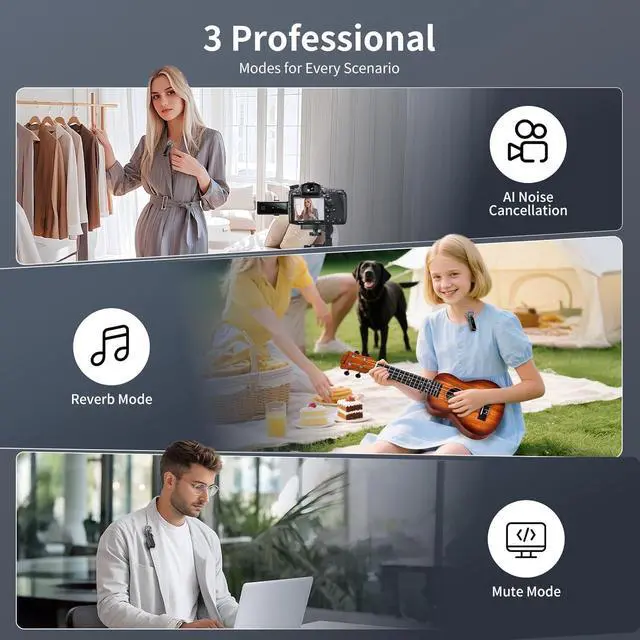All Recording Scenarios: 4 audio modes (Original/Noise Reduction/Mute/Reverb) for vlogging, singing, interviews, online classes, podcasting. Real-time monitoring via headphone jack. Charge-while-recording function. 100ft/30m wireless range for outdoor shoots and interviews. Clip-on design for easy attachment