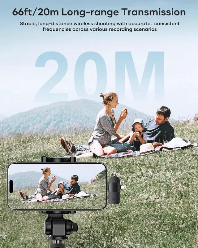 Portable Wireless Mini Microphone: With a compact and portable design, this mini microphone can be handheld or clipped onto clothing. The iPhone-specific microphone provides stable transmission within a range of 66 feet in unobstructed environments. Ideal for influential content creators, TikTokers, and YouTubers, it ensures clear long-distance recording or video shooting both indoors and outdoors.