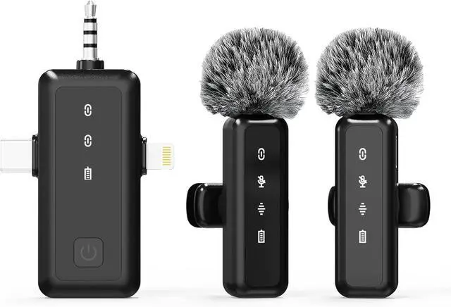 Rich Accessories: Rich accessories to enhance your video streaming recording experience, wireless microphone includes mini microphone x 2, 3IN1 receiver x 1, USB-C charging cable x 2, storage bag x 1, 2 foam microphone covers, 2 furry outdoor microphone windshields, user manual x 1