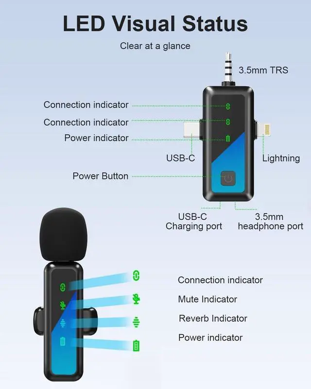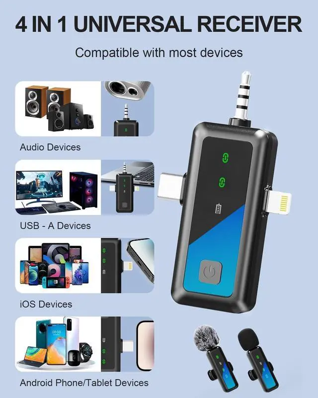 Wide Compatibility: The upgraded wireless microphone is equipped with a 3-in-1 universal receiver, no need to replace multiple separate interfaces or interface cables. Compatible with iPhone (including iPhone 15/16), iPad, Android smartphones, PC, camera, laptop, etc. The mini microphone is suitable for interviews, live broadcasts, podcasts, youtube, instagram, TikTok, blogs