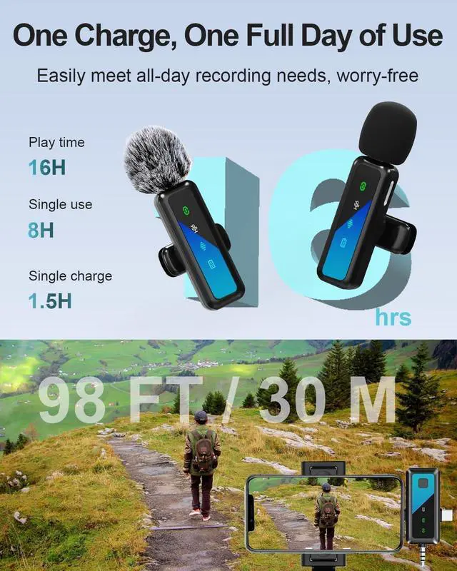 Long Battery Life: Small wireless microphone with big capacity, each transmitter is equipped with 1 70mAh battery, which can be used for 6-14 hours on a single charge. There is a USB-C charging port on this iPhone microphone receiver, which can be used to charge the phone and ensure uninterrupted recording