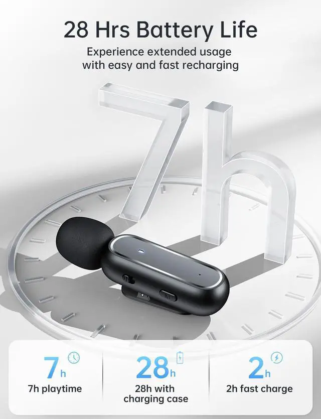 Long Battery Life & Rechargeable Transmitter and Receiver: You can use this wireless lavalier microphone up to 7 hours with only 1.5 hours charging time. With the Charging Case, every time the case is fully charged, which allow to use the mics for 28 hours. While using the lapel microphone wireless, you can charge your device at the same time.