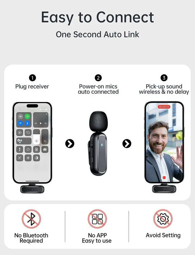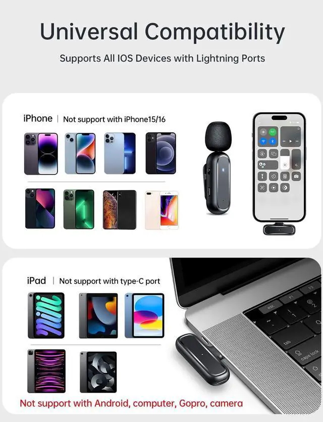Compatible with Most Devices: Our Wireless microphones for iphone are compatible with Lightning port devices (iPhones and iPads). Their lightweight and clip on microphone design makes them ideal for various applications, including video recording, live streaming, podcasting, interviews, online conferencing, vlogging, YouTube, TikTok, and more.