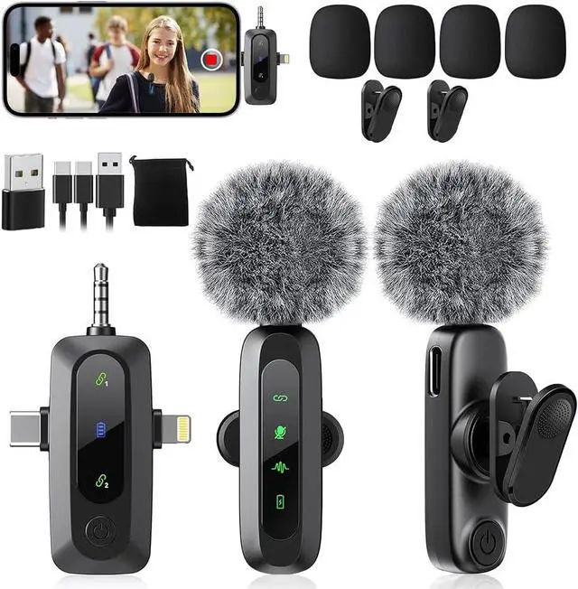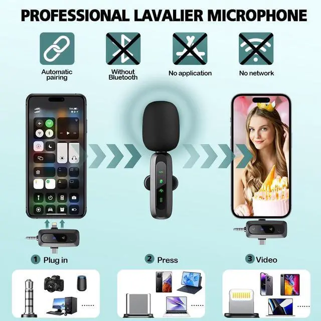 Plug & Play: The wireless microphones requires no apps or Bluetooth pairing. Just connect the receiver to your device and turn on the mini microphone to pair automatically without complicated settings. Get perfect recordings with plug&play 3 IN 1 microphone for iphone, compatible with a wide range of devices, including USB-C, Lightning, 3.5 mm jack and PC. LED display shows device status at a glance, making setup intuitive. Compatible with iPhone/iPad/Android/PC.