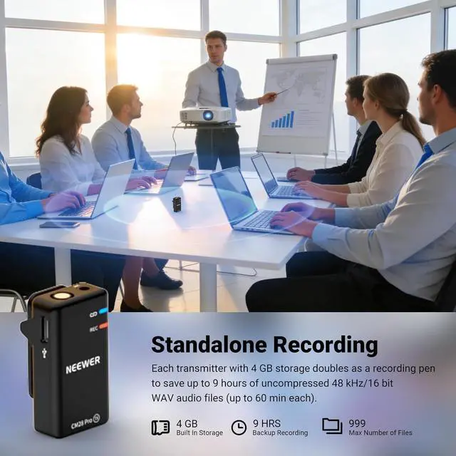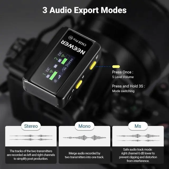 4GB Storage Standalone Recording Each transmitter with 4GB storage doubles as a recording pen to save up to 9 hours of uncompressed 48KHz WAV audio files (up to 30min each) and supports decibel (dB) gain with a tap. Low frequency ensures accurate and warm voice recording. An LCD screen displays export modes, volume, battery levels, connection status, noise cancellation, and other info. 3 audio export modes available: Mono, Stereo, and Ms