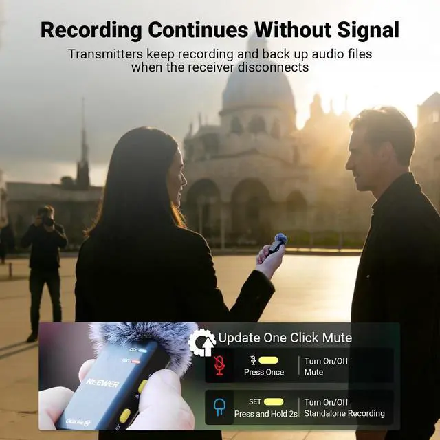 One Click Noise Canceling/Mute Transmitters offer one click noise cancellation and mute functions, with dual LED indicators displaying recording status. Two windshields minimize wind noise for clearer outdoor recording, while the compact cordless mic can securely attach to clothing via magnets or be used handheld