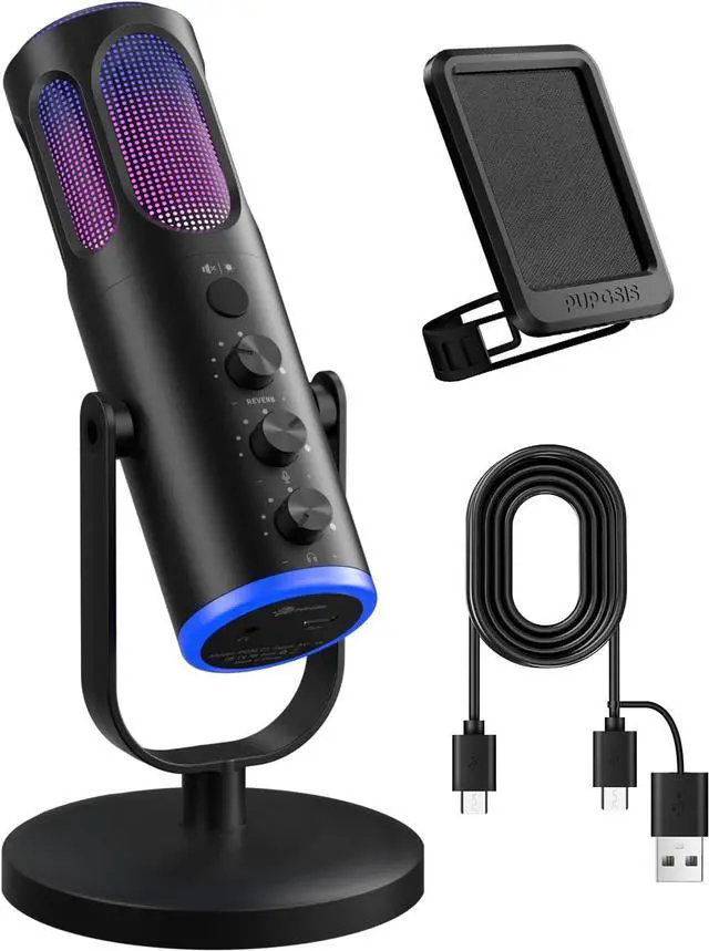 Product Includes: The condenser microphone comes with USB Condenser Microphone *1, Microphone pop-filter*1, USB A&C to USB C2-in-1 Cable *1, Portable Stand *1, User Manual*1