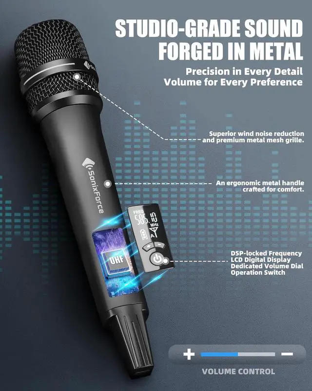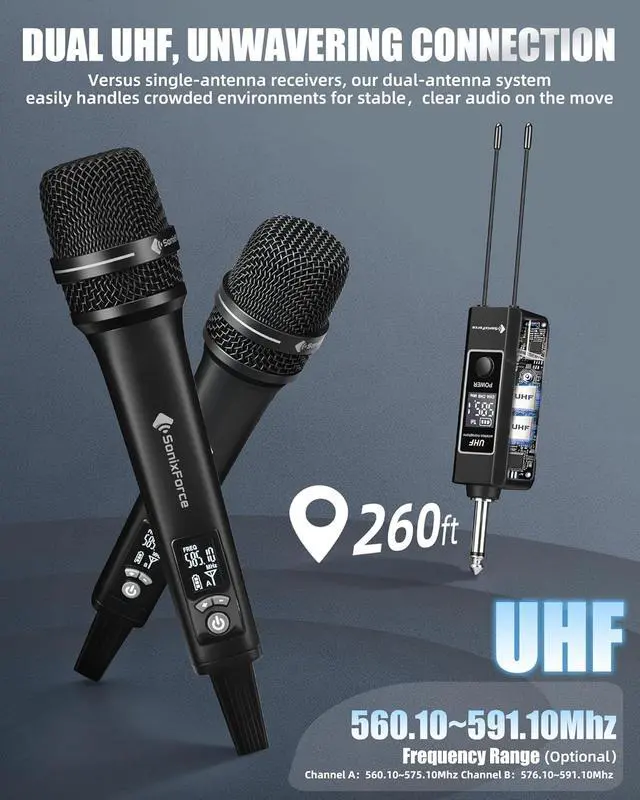 UHF Wireless Microphones - Sonixforce' s UHF system utilizes FCC-certified bands (550-591 MHz) to provide a rock-solid, long-range link up to 260ft. With superior signal penetration and manual frequency selection, it guarantees stable, uninterrupted audio even in challenging environments with walls, crowds, and interferenceensuring no dropouts, crackling, or interruptions