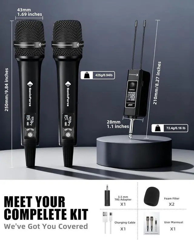 Engineered for Critical Moments - If your performance can' t afford a glitch, trust SonixForce UHF wireless microphones. Perfect for duets, presentations, karaoke, salons, stage and big events. Features two handheld microphones and a dual-channel receiver that supports true simultaneous use. Provided completed kit. All backed by a 1-year warranty and 24/7 support