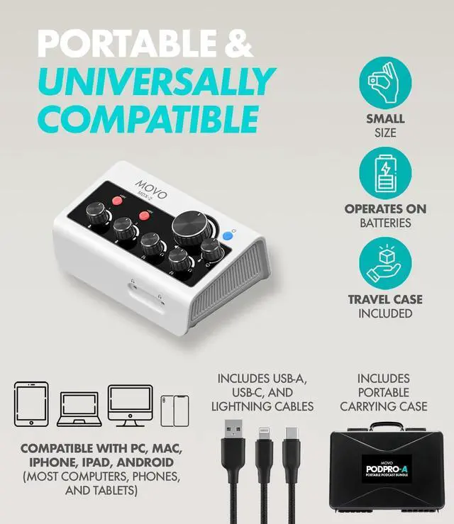 MDX-2 DUAL USB AUDIO INTERFACE: Compact with battery-powered capabilities(with a 3-hour battery life); includes USB-A, USB-C, and Lightning cables for seamless connection to PC, Mac, iPhone, iPad, and Android devices. Comes with a travel case for on-the-go recording. Includes 2 XLR inputs (with 48V phantom power), 2 headphone outputs, and stereo 1/4" outputs