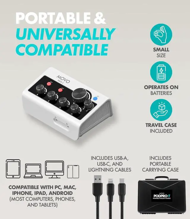 PODCAST EQUIPMENT BUNDLE FOR 2 - The Movo PodPro-T includes the dual channel MDX-2 usb audio interface and 2 CastMic XLR Dynamic Microphones. The perfect complete podcast kit for content creators on the go
