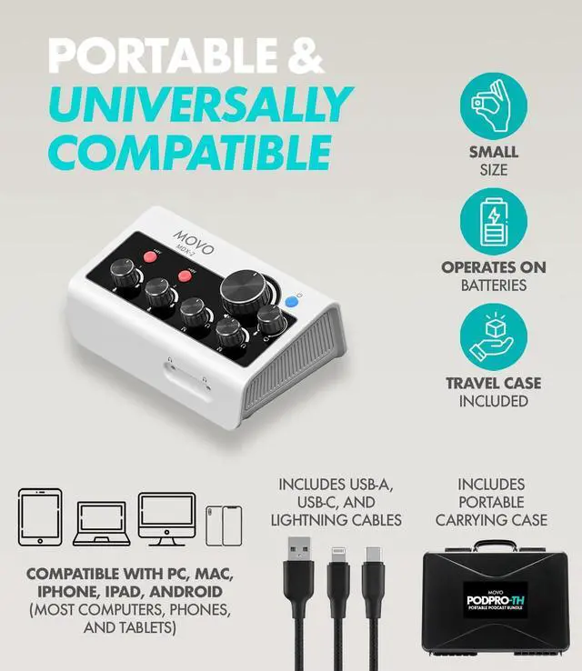 MDX-2 DUAL USB AUDIO INTERFACE: Compact with battery-powered capabilities(with a 3-hour battery life); includes USB-A, USB-C, and Lightning cables for seamless connection to PC, Mac, iPhone, iPad, and Android devices. Comes with a travel case for on-the-go recording. Includes 2 XLR inputs (with 48V phantom power), 2 headphone outputs, and stereo 1/4" outputs