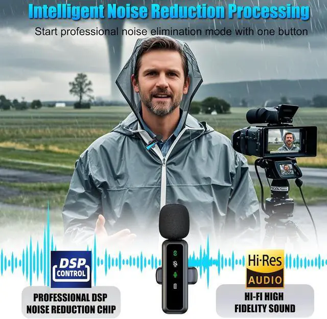Noise Cancellation: Equipped with cutting-edge AI-powered noise cancellation technology, this mini wireless microphone offers three adjustable levels of noise reduction. Whether you' re in a noisy coffee shop or a windy outdoor spot, just press a button to pick the best noise-canceling level. With 360-degree omnidirectional sound collection and minimal real-time sound delay, it ensures a seamless audio experience for all your recordings or communications.