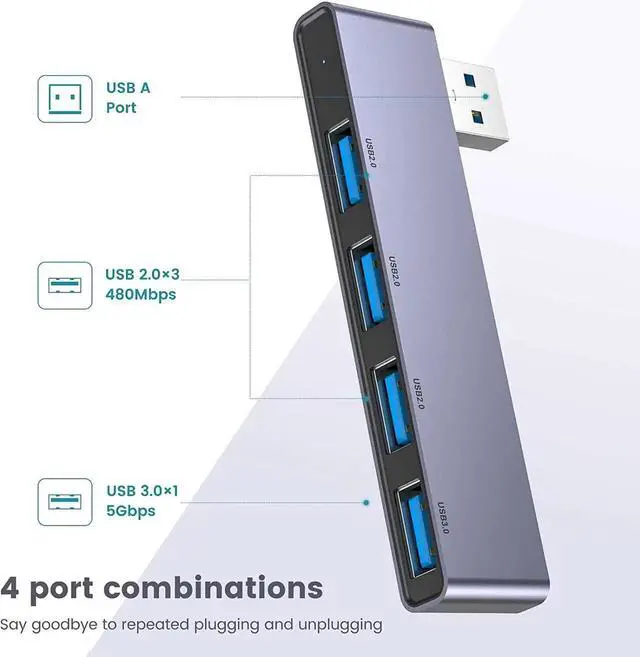 Our usb port expander for laptop contains 1*USB 3.0 and 3*USB 2.0. The USB 3.0 supports super faster data transfer up to 5Gbps which is 10X faster than USB 2.0 (480 Mbps), which allows you to transfer datas in just seconds; USB extension hub was built in OTG function chip, it can easily connect the mouse, keyboard, USB disk, and other USB devices.