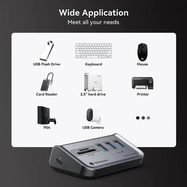 Expand Your Devices with EaseThis USB 3.0 hub effortlessly expands your device' s connectivity with 3 USB-A 3.2 GEN1 ports (5Gbps), 1 TF slot, and 1 SD slot, ensuring seamless connectivity. The card reader slot includes SD and micro SD card reader slots, allowing for easy reading of SDHC, SD, Micro SDXC, Micro SDHC, Micro SD, and MMC cards.