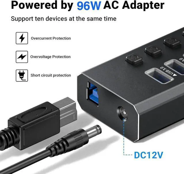 96W Power Adapter: 16 Port Powered USB Hub with 12V/ 8A Power Adapter can transfer data for USB devices and charge your mobile phones, tablets, cameras and speakers. Built-in surge protector keeps your devices and data safe. External power supply ensures multiple devices work simultaneously