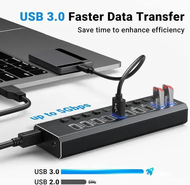 Aluminum Housing & Sturdy Desing: USB 3.0 Splitter made of premium aluminum alloy design, Sturdy and reliable, compact and not easy to move that fits naturally for home and workplaces. Each high-speed USB 3.0 port of the USB 3 hub has an On/Off switch with LED indicator, easy to show power status. You can turn on/off the separate USB port without having to unplug the whole hub