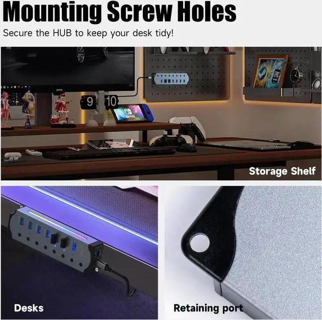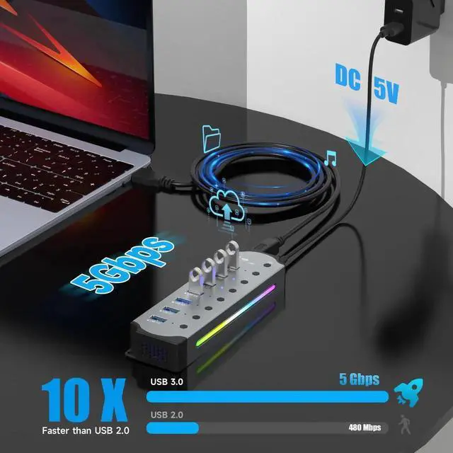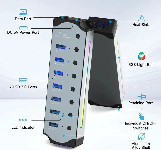 This 7-port RGB USB hub not only meets all your data needs, but also adds vitality to your workspace through customizable lighting. In addition, it can serve as a charger for your device and an ideal companion for your desk!