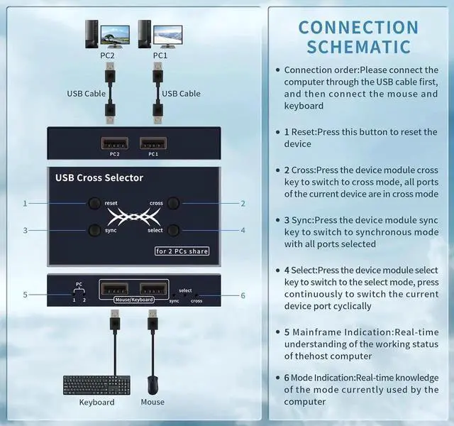 The USB Cross Selector allows 2 computers to use a single mouse and keyboard in three modes of operation: Cross Mode, Synchronized Mode and Select Mode. USB Cross Selector is a convenient Keyboard Mouse Switch that supports keyboard hotkey selection.