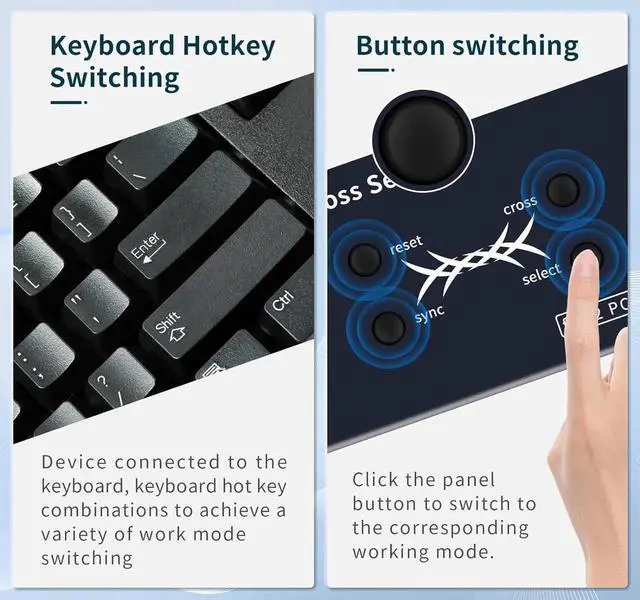The working mode and state of the usb cross selector can be switched by using the push buttons and keyboard hotkeys. Adjust the DPI rate of the mouse with keyboard hotkeys.