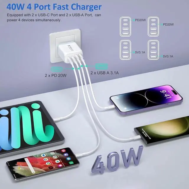 USB C Wall Charger, 2 Pack 40W 4-Port USB C Charger Block, Fast Charging Block Dual Port PD+QC Fast Plug Type C Charging Brick for i-Phone 15 14 13 12 Pro Max, i-Pa-d Pro, Android Smartphones (White)