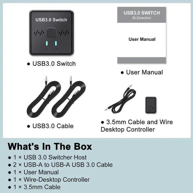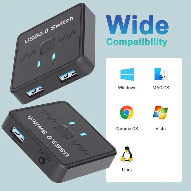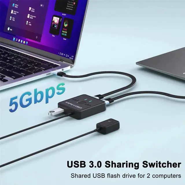 Easy to Use :The USB switcher 2 computers only need plug and play, No extra power supply is required, no need to install drivers. (Included USB 3.0 Cable and Desktop Controller)