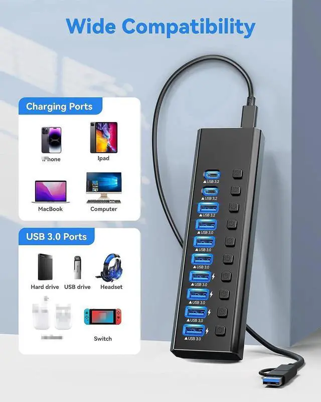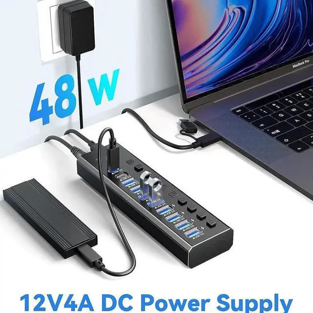 - The powered USB hub comes with individual switches for each USB port, which means you no longer have to constantly plug and unplug devices. Plus, this feature also protects your ports from any potential damage.