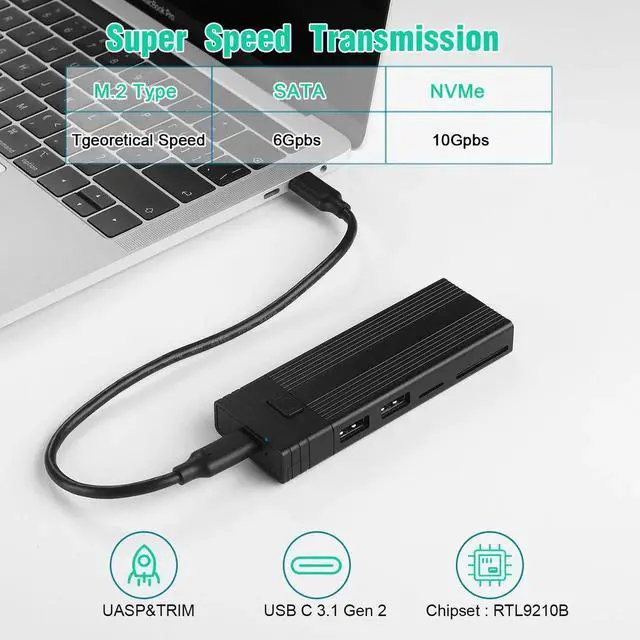 Chip RTL9210B & Tool-Free & Overheating Protection USB C 3.1 Gen 2 10Gbps to M. 2 NVME PCIe USB C 3.1 Gen 2 6Gbps to M. 2 SATA PCIe Backup and save files faster than ever before over USB, with read and write speeds of over 900 MBps/600MBps, when connected to a Thunderbolt 3 or USB 3.1 Gen 2 port. Tool-Free USB C to M. 2 NVMe SATA Enclosure's tool-free design allows the quick installation of an M. 2 NVMe or M. 2 SATA SSD in just a couple of seconds.